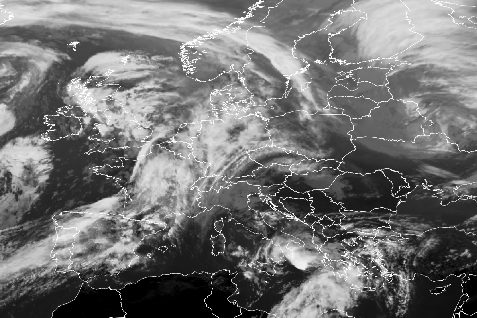 Satellite images show current cloud cover over Europe from the perspective of Meteosat satellites. Cloud cover is highlighted in white, with lighter colors indicating thicker cloud layers over a given area. Infrared spectrum enables tracking cloud movement even during nighttime hours. Cloud cover satellite images are updated every 15 minutes.